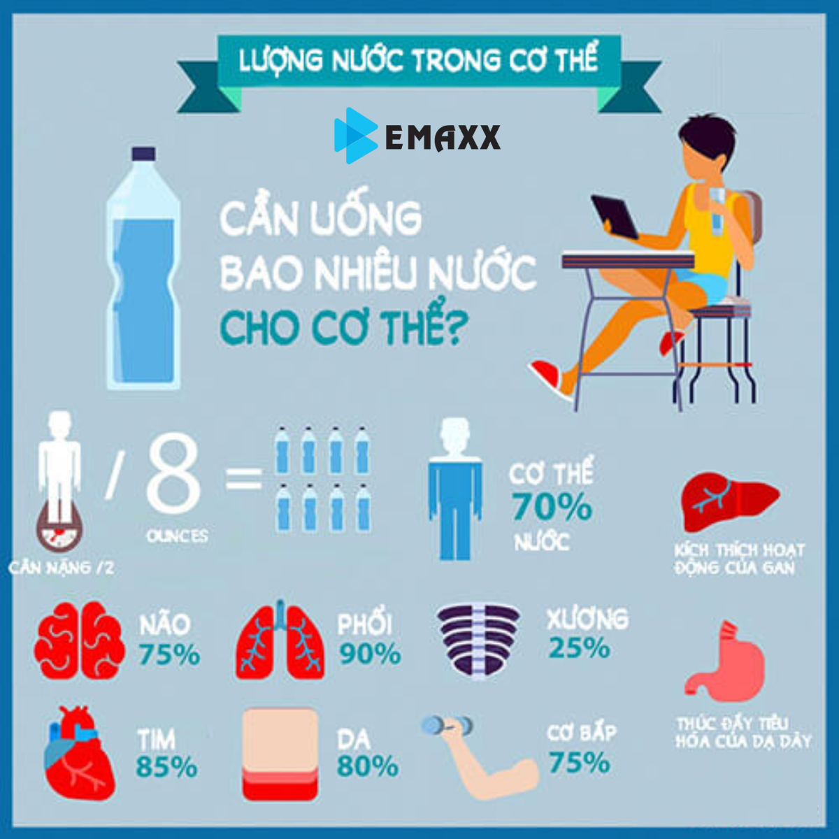 - Tăng cường năng lượng: Mất nước có thể dẫn đến mệt mỏi và thiếu năng lượng. Uống đủ nước giúp bạn cảm thấy tỉnh táo và tràn đầy năng lượng hơn.
